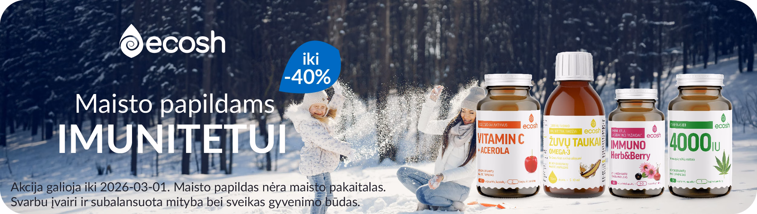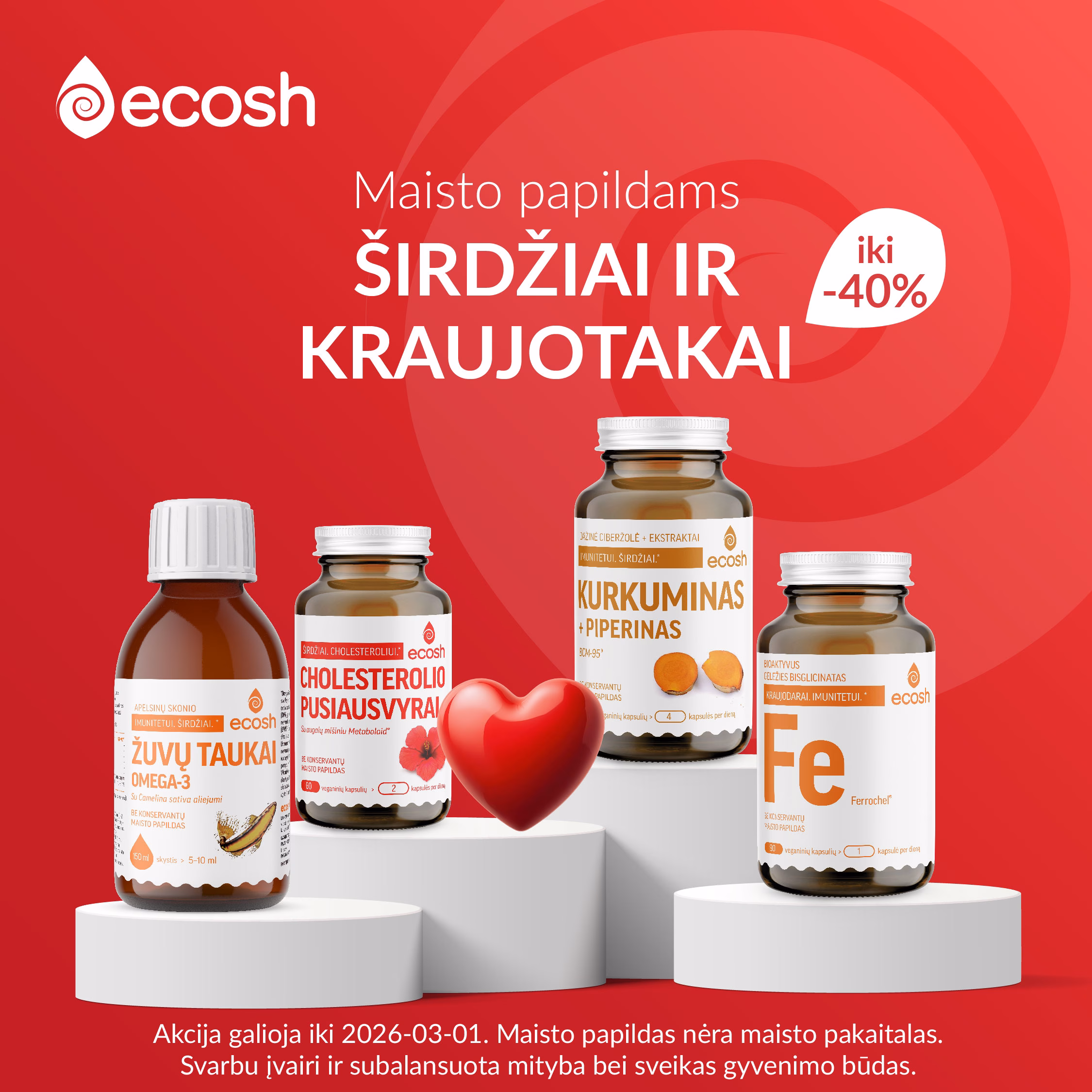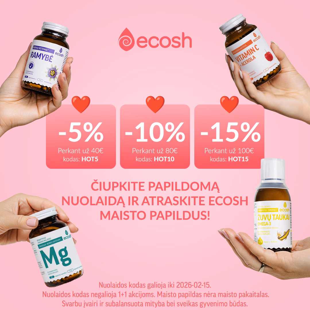 Rinkitės sprendimus, kurie tinka Jūsų kasdienybei.🌿 Imuniteto, širdies ir kraujotakos bei vitamino D papildams taikomos iki -40 % nuolaidos.🎉❄️ 🛒 Užsukite į www.ecosh.lt ir iš plataus asortimento išsirinkite būtent Jums tinkamus maisto papildus. Akcijos 1+1 metu, antra pakuotė į krepšelį įsideda automatiškai. Nuolaidos nesumuojamos. Akcijos metu negalima atsiskaityti sukauptais ECOSH pinigais. ECOSH pasilieka teisę bet kada keisti akcijos sąlygas, dovanų skaičius ribotas. 📌 Akcijos vyksta iki 2026-03-01. Maisto papildas nėra maisto pakaitalas. Svarbu įvairi ir subalansuota mityba bei sveikas gyvenimo būdas. #ecoshlietuva #maistopapildai #akcijos #nuolaidos