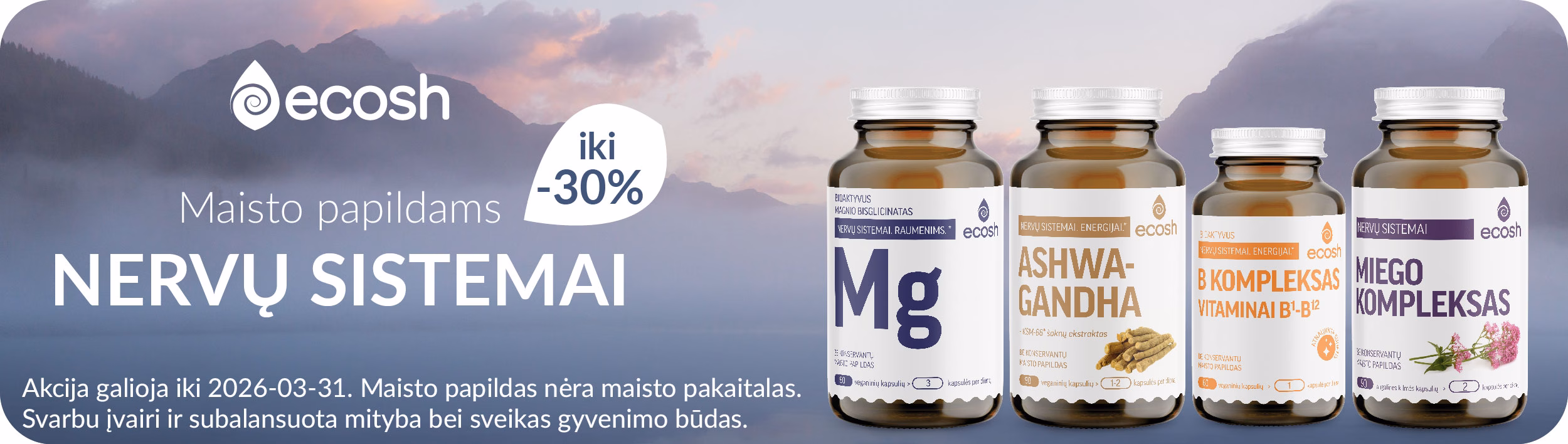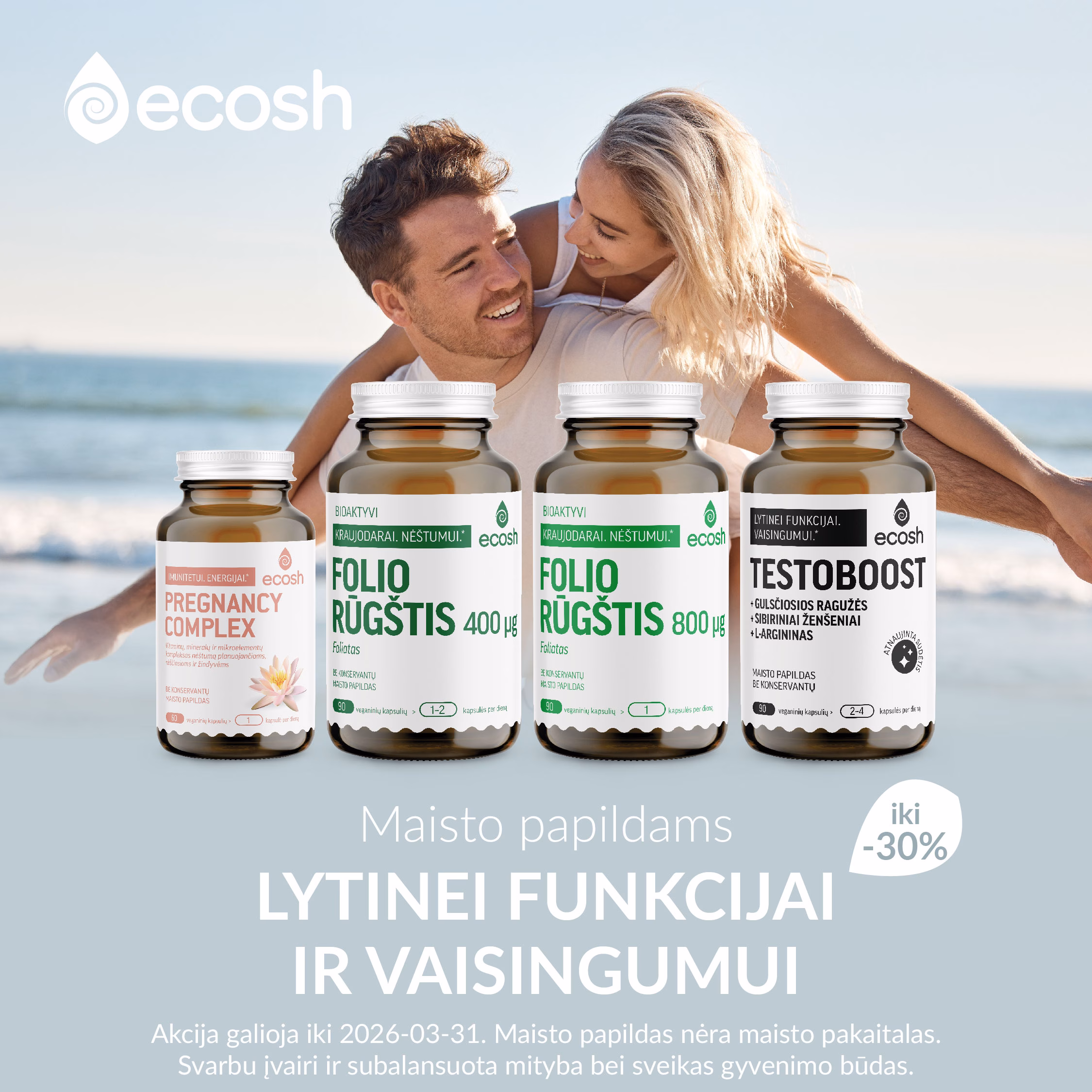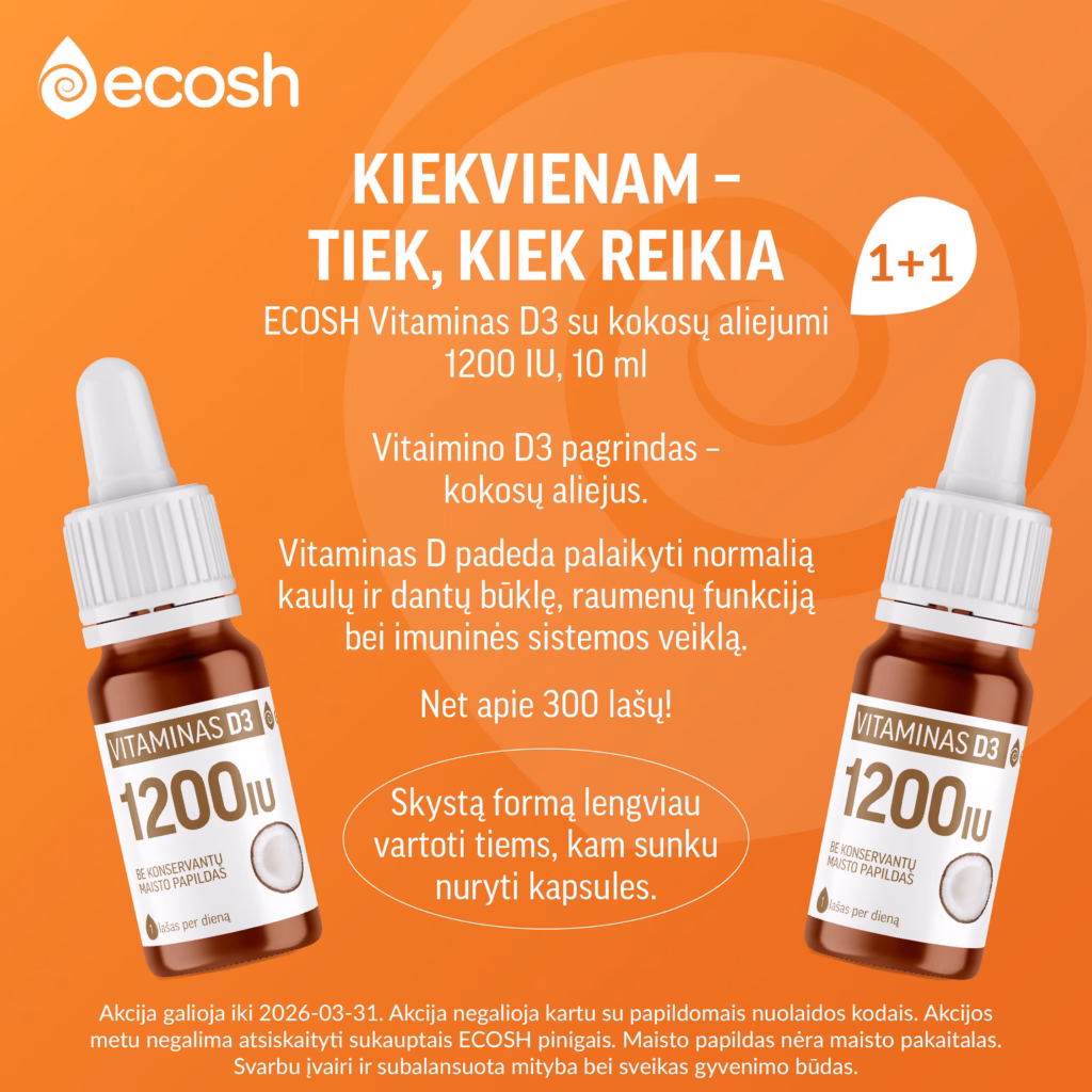 Pavasarį pasitinkame su ypatingomis nuolaidomis atrinktiems maisto papildams!🌿 Visą kovo mėnesį taikomos nuolaidos maisto papildams nervų sistemai, moterims, nėštumui bei vaisingumui. 🌸 🛒 Užsukite į www.ecosh.lt ir iš plataus asortimento išsirinkite būtent Jums tinkamus maisto papildus. Esant 1+1 akcijai, antra pakuotė į krepšelį įsideda automatiškai. Nuolaidos nesumuojamos. Akcija negalioja kartu su papildomais nuolaidos kodais. Akcijos metu negalima atsiskaityti sukauptais ECOSH pinigais. ECOSH pasilieka teisę bet kada keisti akcijos sąlygas, dovanų skaičius ribotas. 📌 Akcija vyksta iki 2026-03-31. Maisto papildas nėra maisto pakaitalas. Svarbu įvairi ir subalansuota mityba bei sveikas gyvenimo būdas. #ecoshlietuva #maistopapildai #akcijos #nuolaidos #pavasaris