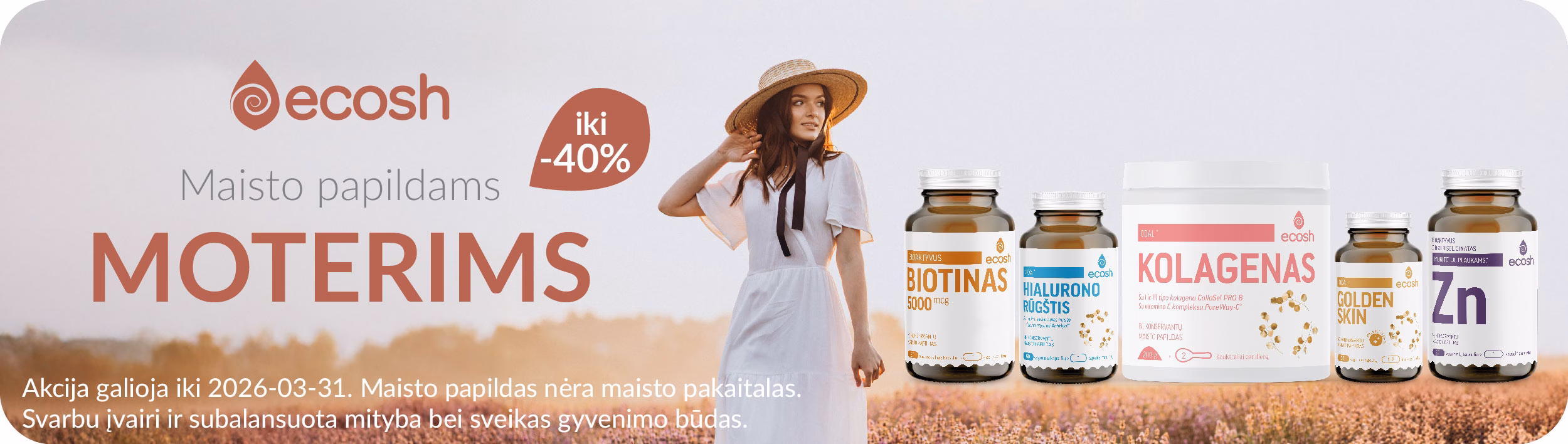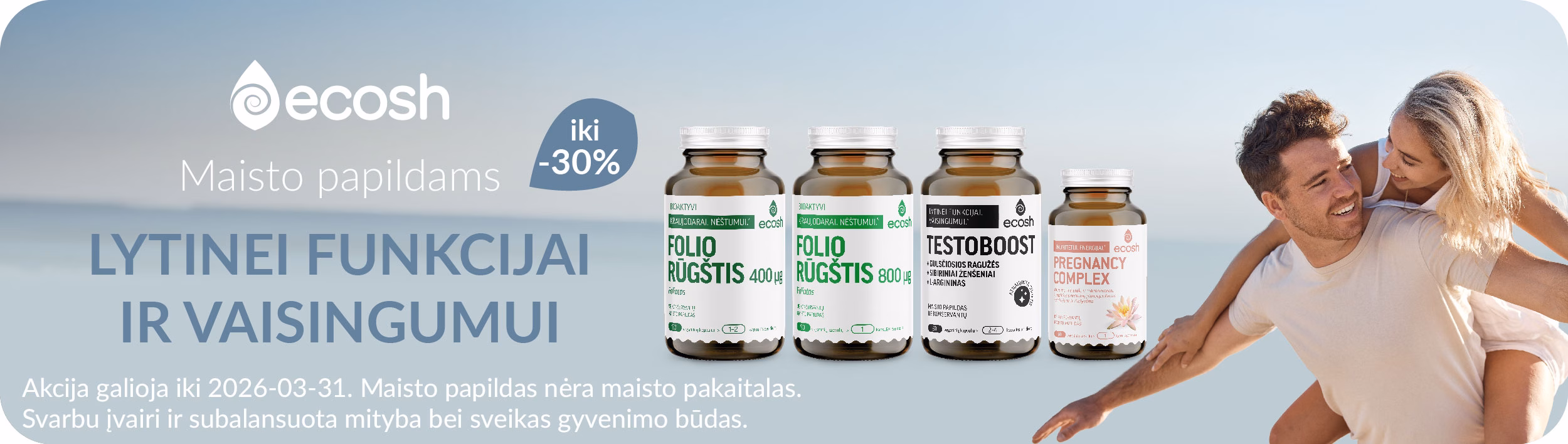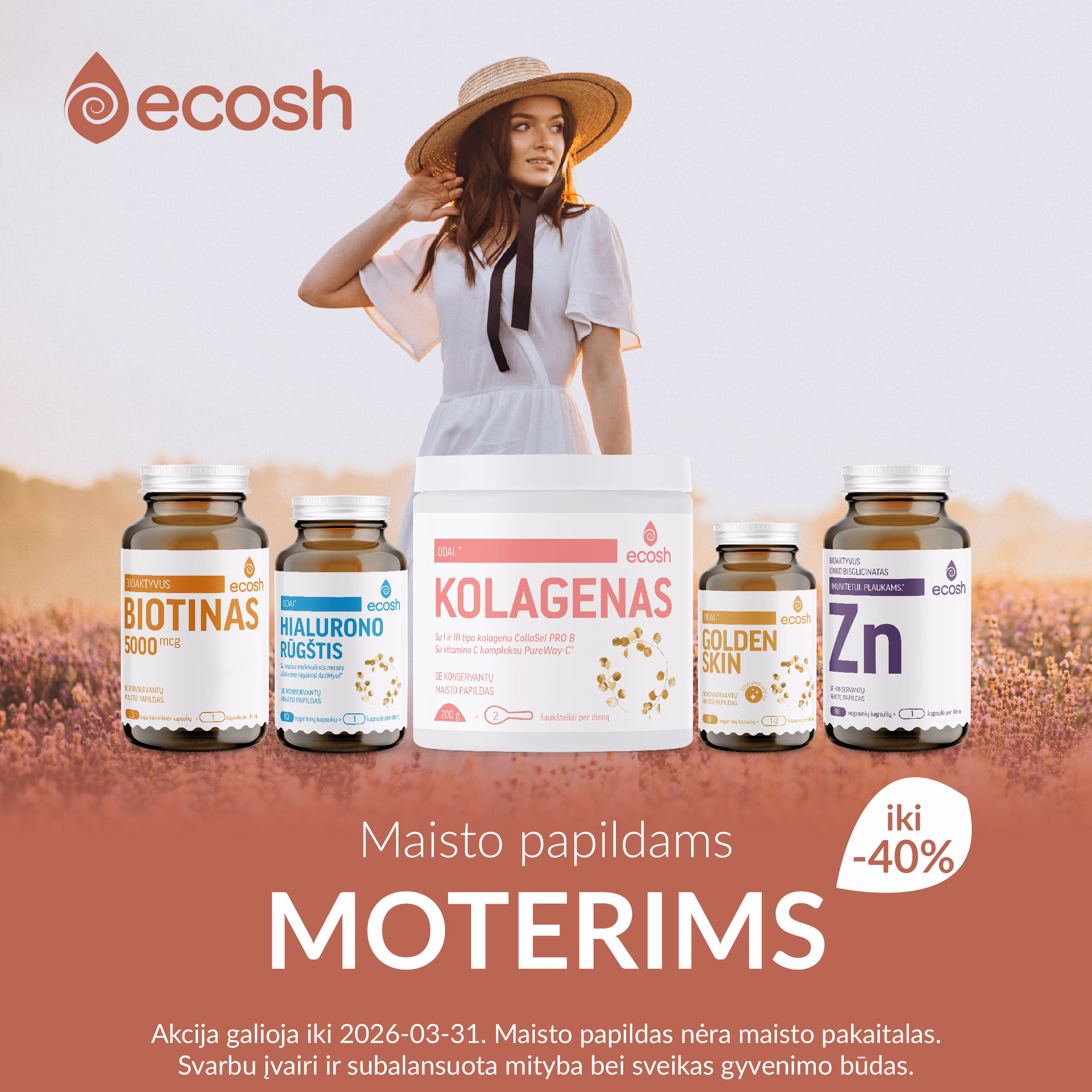 Pavasarį pasitinkame su ypatingomis nuolaidomis atrinktiems maisto papildams!🌿 Visą kovo mėnesį taikomos nuolaidos maisto papildams nervų sistemai, moterims, nėštumui bei vaisingumui. 🌸 🛒 Užsukite į www.ecosh.lt ir iš plataus asortimento išsirinkite būtent Jums tinkamus maisto papildus. Esant 1+1 akcijai, antra pakuotė į krepšelį įsideda automatiškai. Nuolaidos nesumuojamos. Akcija negalioja kartu su papildomais nuolaidos kodais. Akcijos metu negalima atsiskaityti sukauptais ECOSH pinigais. ECOSH pasilieka teisę bet kada keisti akcijos sąlygas, dovanų skaičius ribotas. 📌 Akcija vyksta iki 2026-03-31. Maisto papildas nėra maisto pakaitalas. Svarbu įvairi ir subalansuota mityba bei sveikas gyvenimo būdas. #ecoshlietuva #maistopapildai #akcijos #nuolaidos #pavasaris