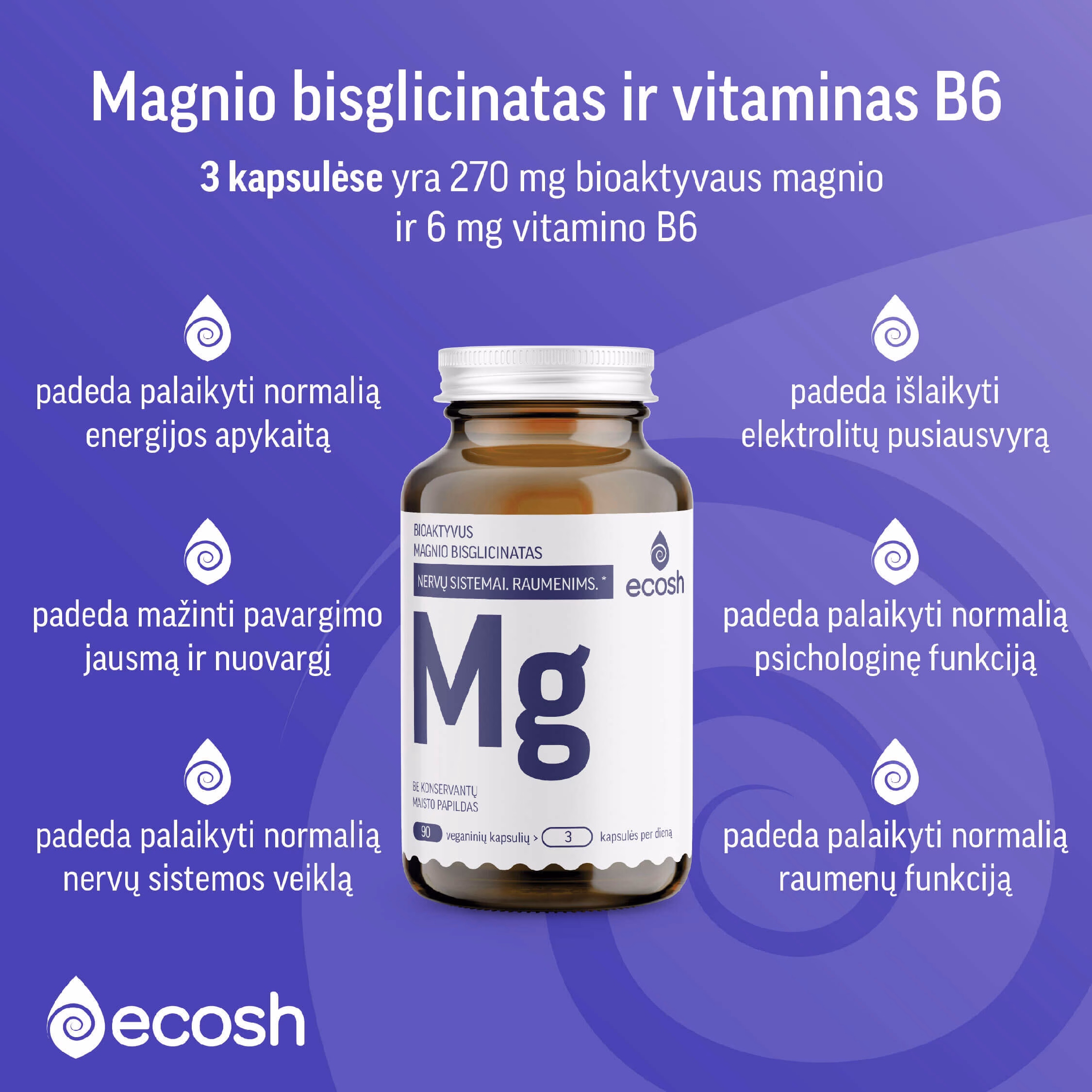 ECOSH Magnis su vitaminu B6 – tai aukštos kokybės maisto papildas su bioaktyvia magnio bisglicinato forma ir piridoksin-5’-fosfatu. Trijose kapsulėse yra 1500 mg magnio bisglicinato (iš kurio elementinio magnio – net 270 mg) bei 6 mg piridoksin-5’-fosfato.