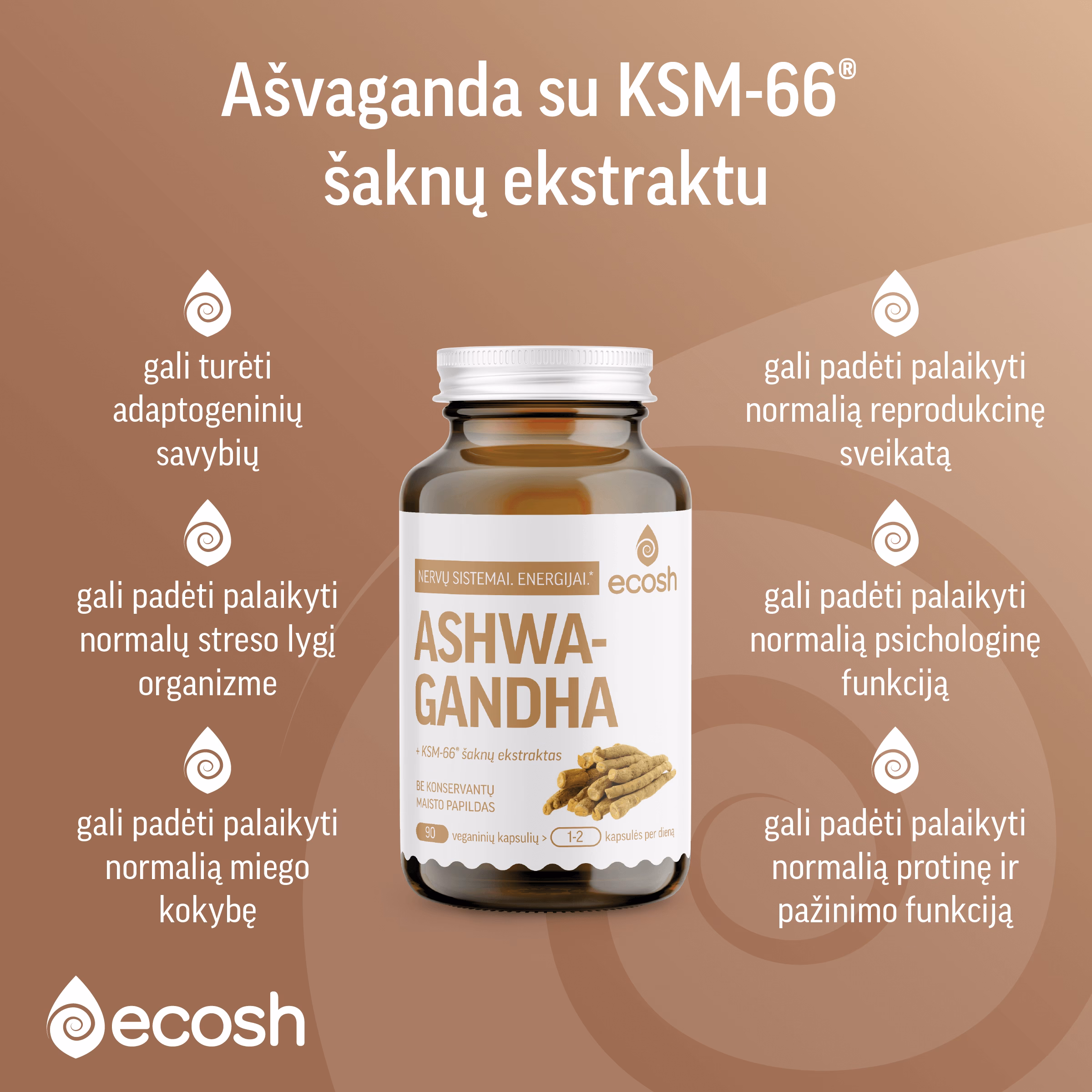 ECOSH AŠVAGANDA (Ashwagandha) maisto papildo sudėtyje – ašvagandų šaknų ekstraktas ir ašvagandų KSM-66® šaknų ekstraktas, kuris iš kitų ekstraktų išsiskiria tuo, kad turi vieną didžiausių pasaulyje vitanolidų koncentraciją, kuri siekia 5%.