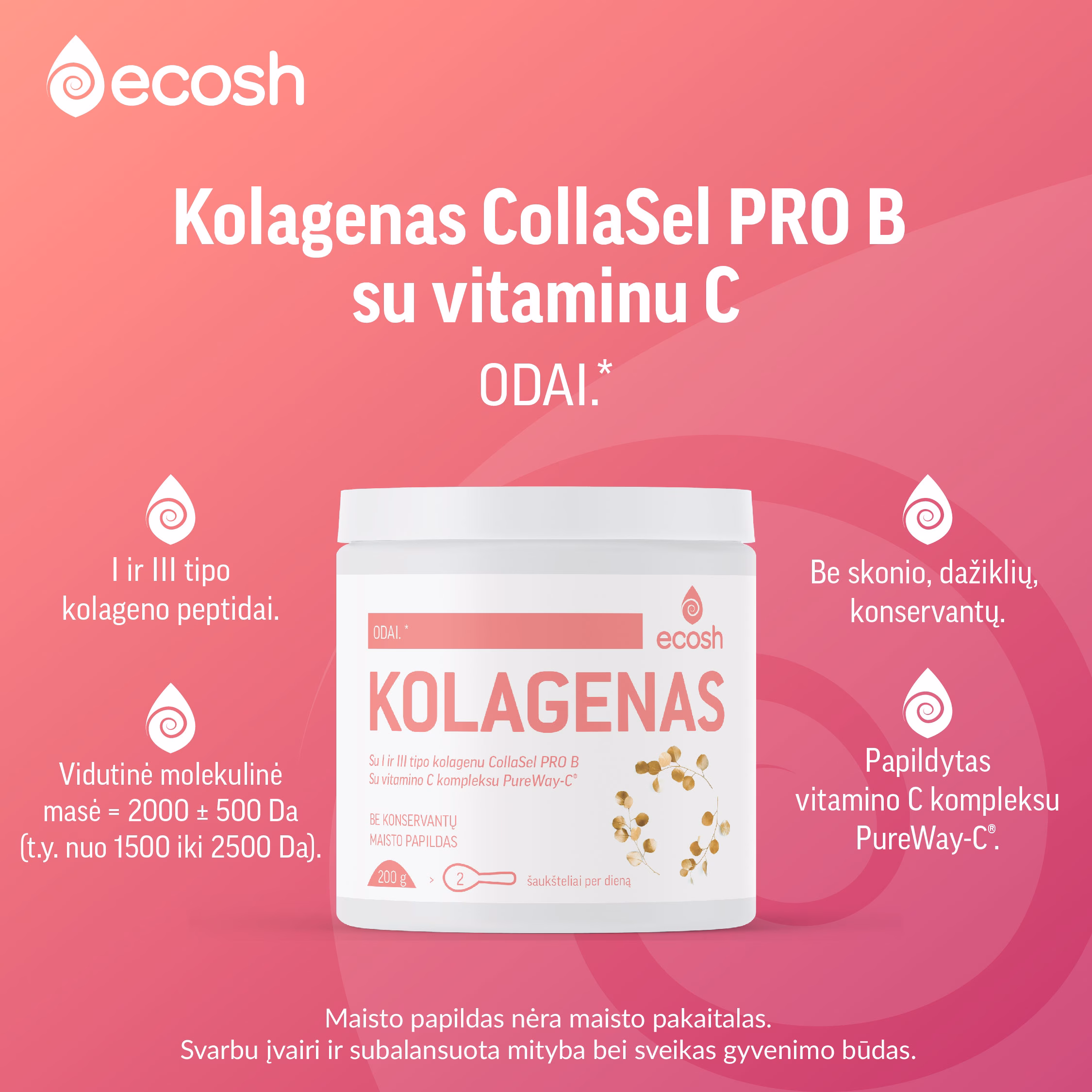 ECOSH Kolagenas – tai beskoniai, lengvai tirpstantys hidrolizuoto kolageno milteliai, kurie gali būti laisvai maišomi ne tik vandenyje, bet ir arbatoje (ne verdančioje), sultyse, daržovių kokteilyje ar kitame pasirinktame gėrime. Maisto papildo sudėtyje – I ir III tipo kolageno peptidai CollaSel PRO B, kurių vidutinė molekulinė masė yra apie 2000 ± 500 Da (t.y. nuo 1500 iki 2500 Da). ECOSH Kolagenas taip pat papildytas vitamino C kompleksu PureWay-C® su natūraliomis augalinėmis riebalų rūgštimis ir citrusinių vaisių bioflavonoidais.