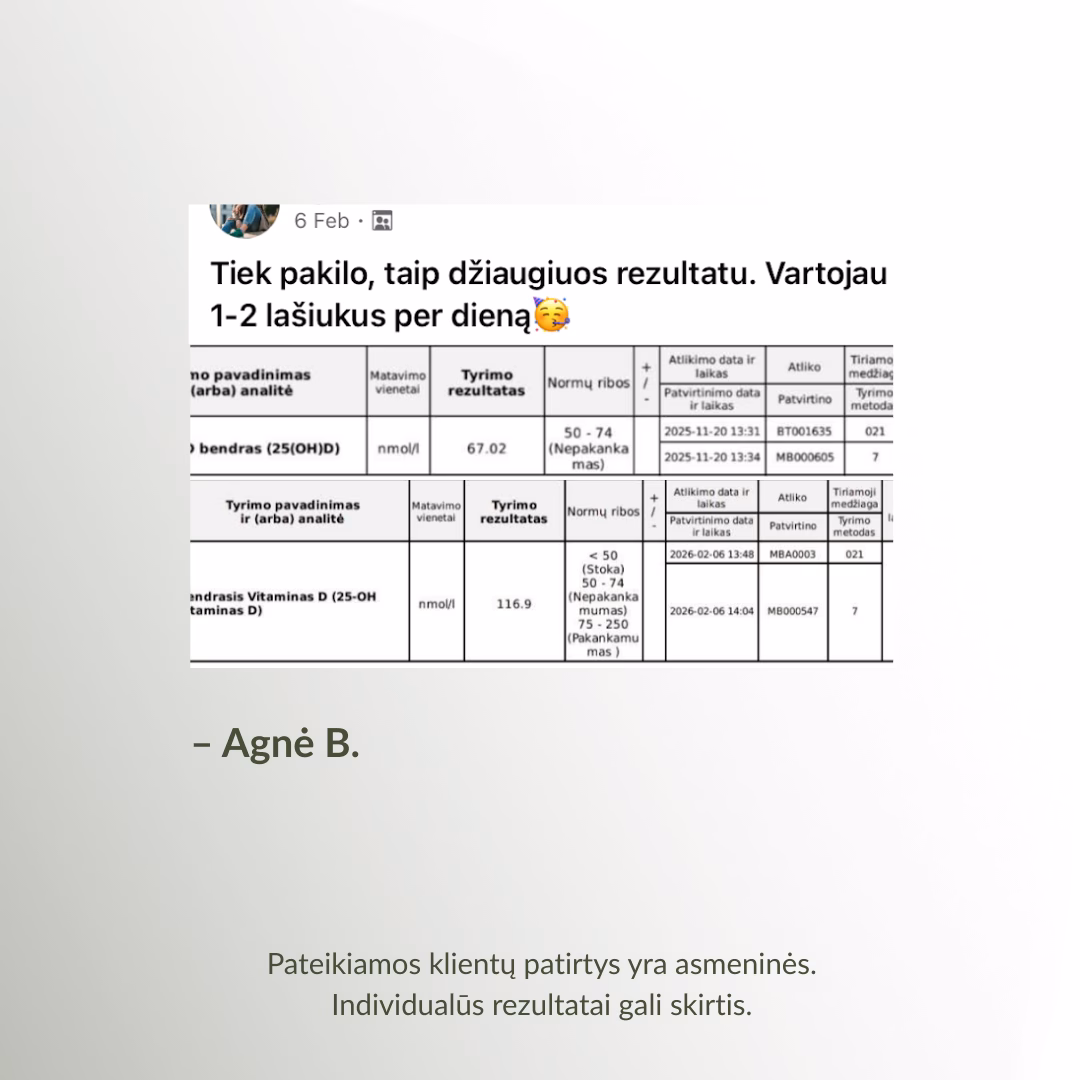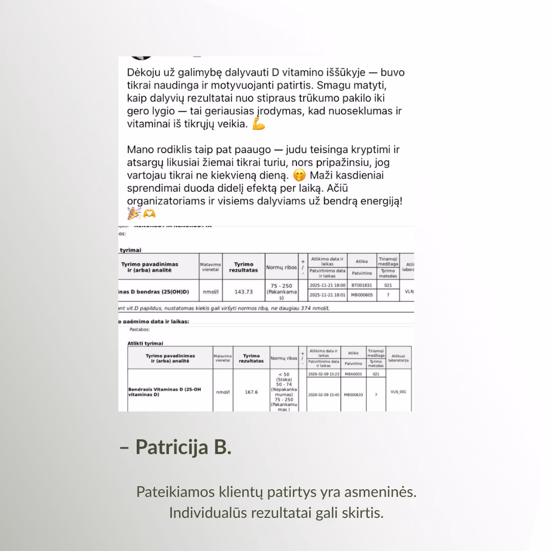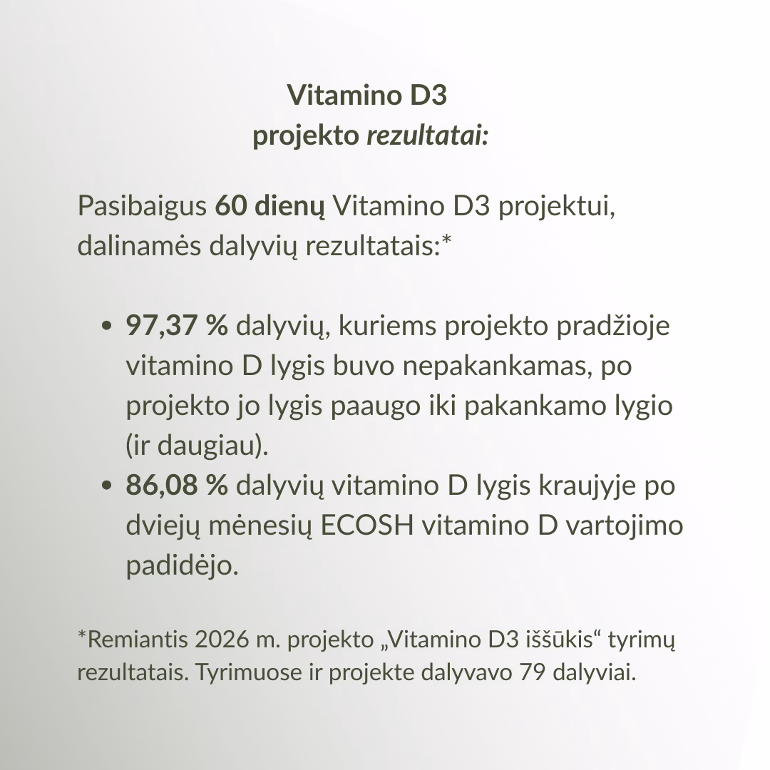 *Remiantis 2026 m. projekto „Vitamino D3 iššūkis“ tyrimų rezultatais. Tyrimuose ir projekte dalyvavo 79 dalyviai.