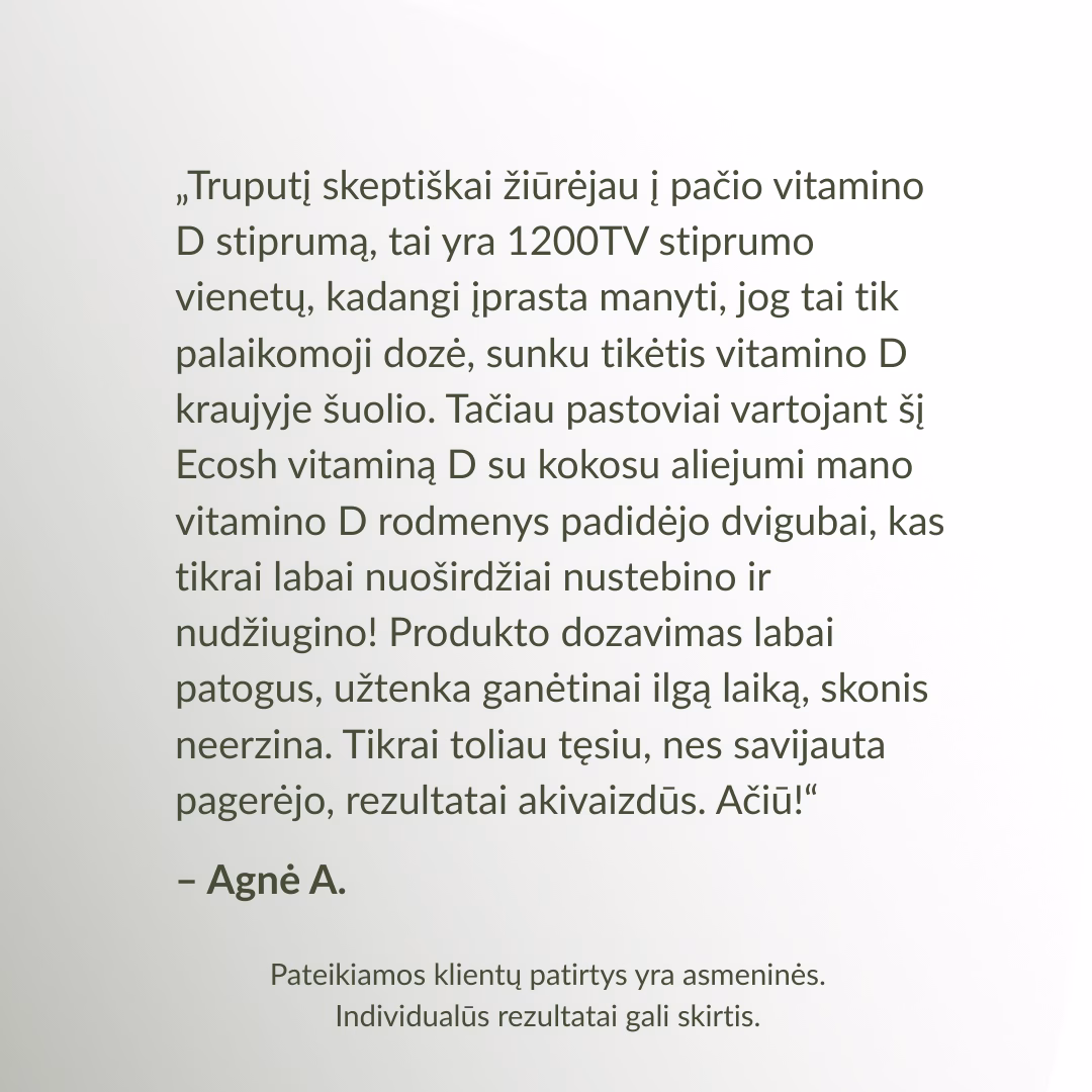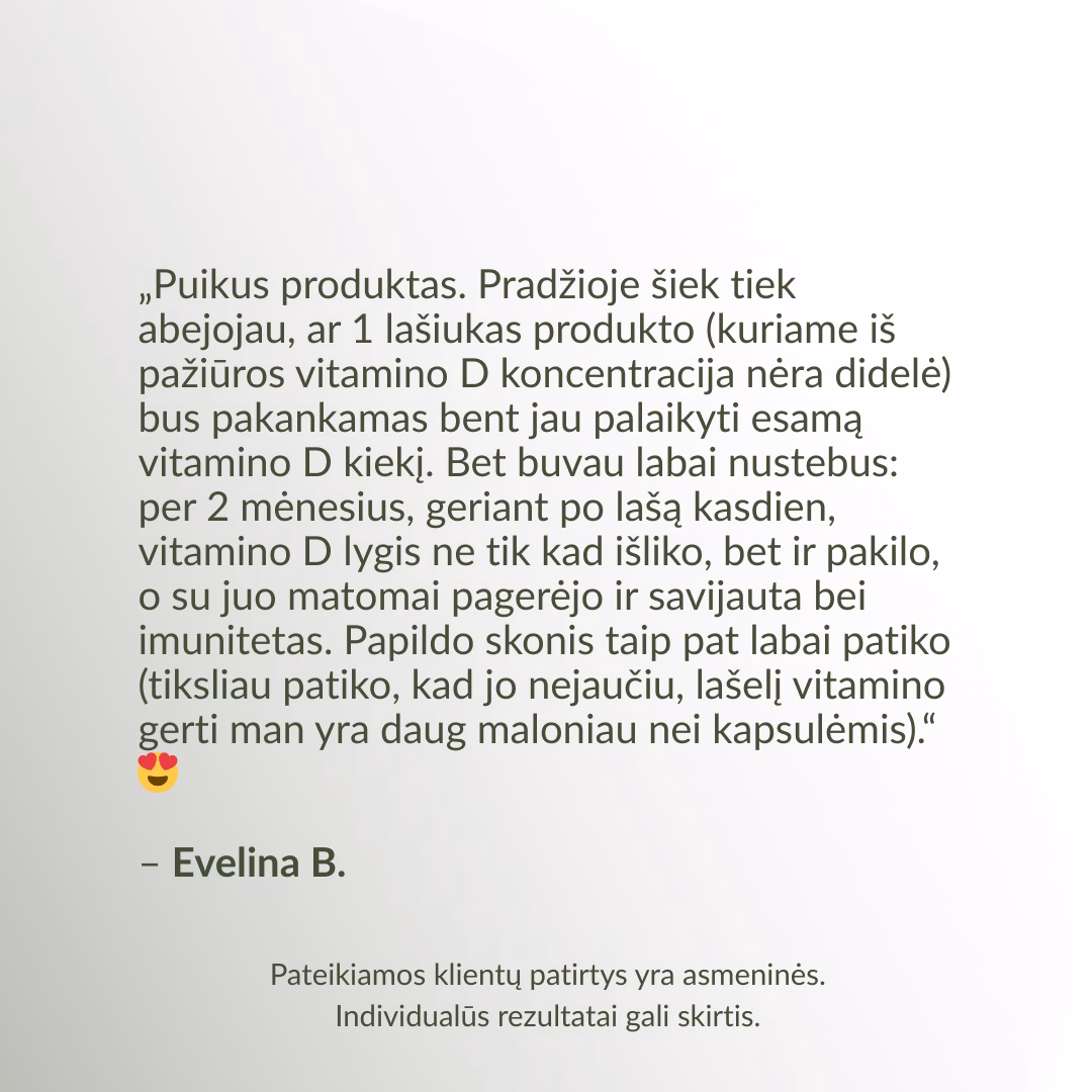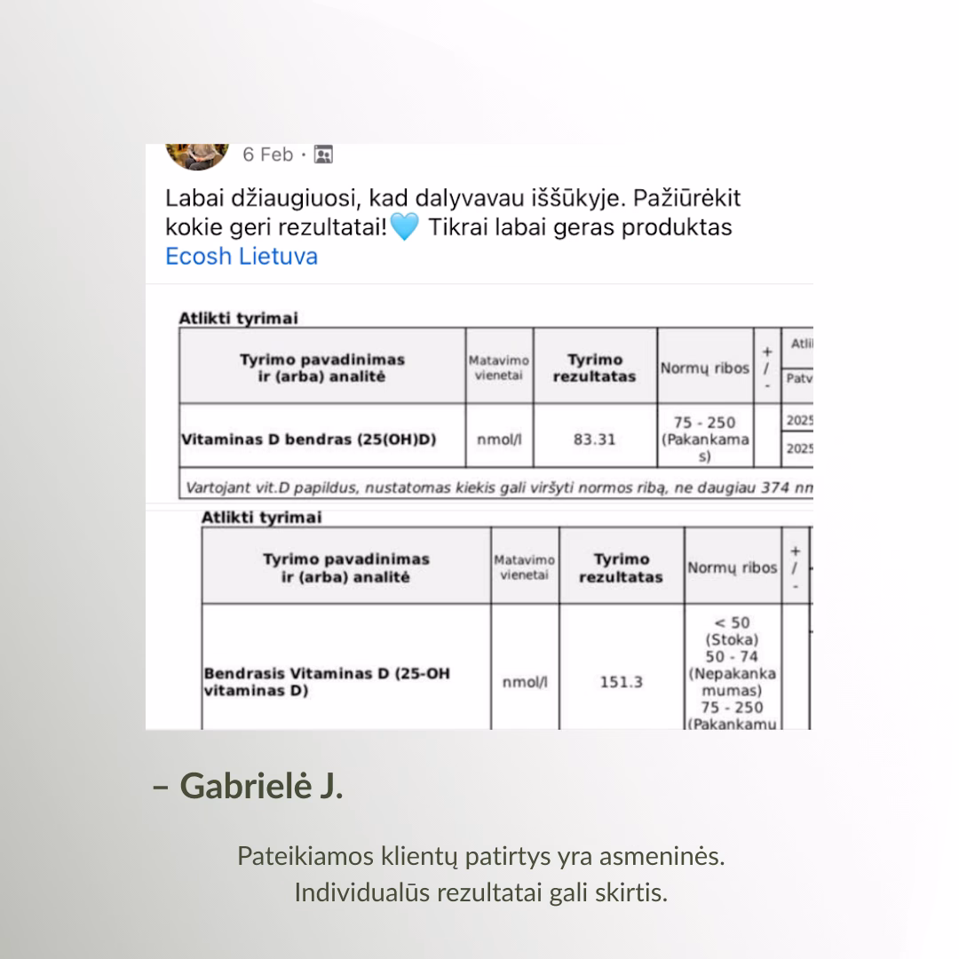 *Remiantis 2026 m. projekto „Vitamino D3 iššūkis“ tyrimų rezultatais. Tyrimuose ir projekte dalyvavo 79 dalyviai.